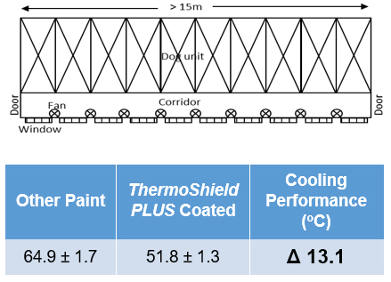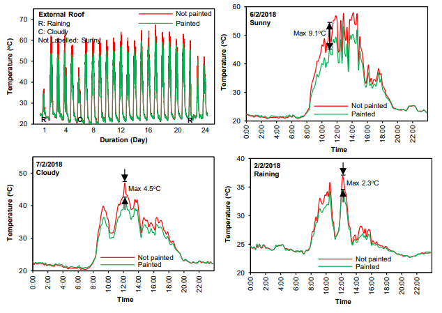 • On a sunny day, it is observed that the temperature between a Nipo ThermoShield+ coated and non-Nipo coated external roof experiences a 5oC to up to 12oC variance. An actual Field Record at beta-site showed 13.1oC difference. The higher the exterior temperature, the better the effect. Please refer observations below.